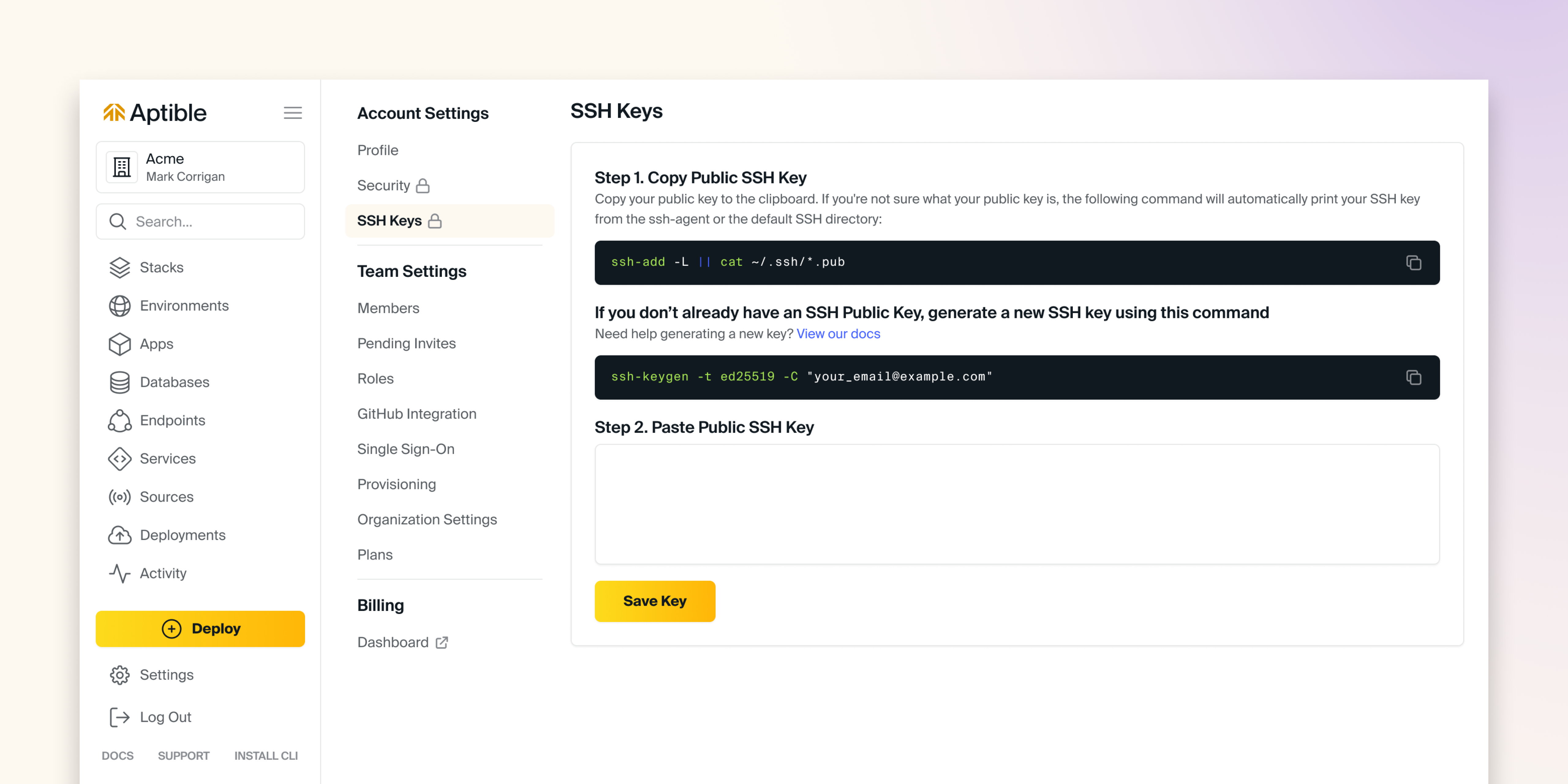 - Paste your Public SSH Key in the text box located in Step 2 listed on the page.