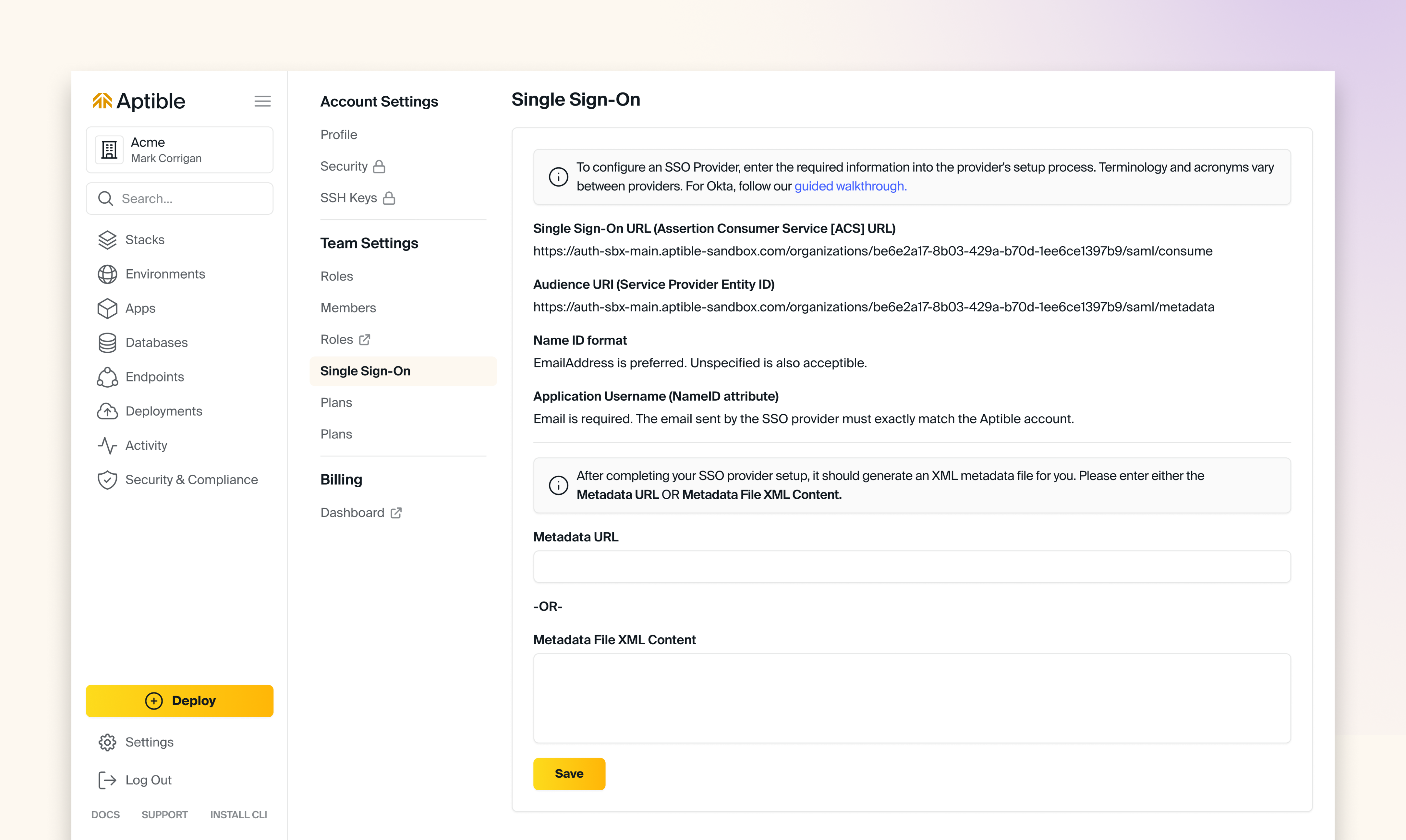 Users exempted from the Require SSO for Access setting can log in using Aptible credentials and access the organization’s resources. Users can be exempt from this setting in two ways:- users with an Account Owner role are always exempt from this setting